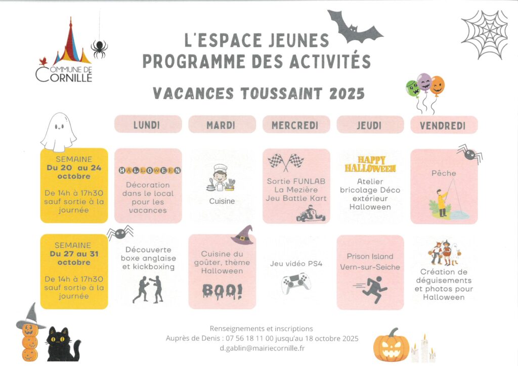 L'ESPACE JEUNES propose des activités aux jeunes de 11 à 17 ans pendant les vacances. Renseignements auprès de Denis au 07 56 18 11 00 d.gablin@mairiecornille.fr